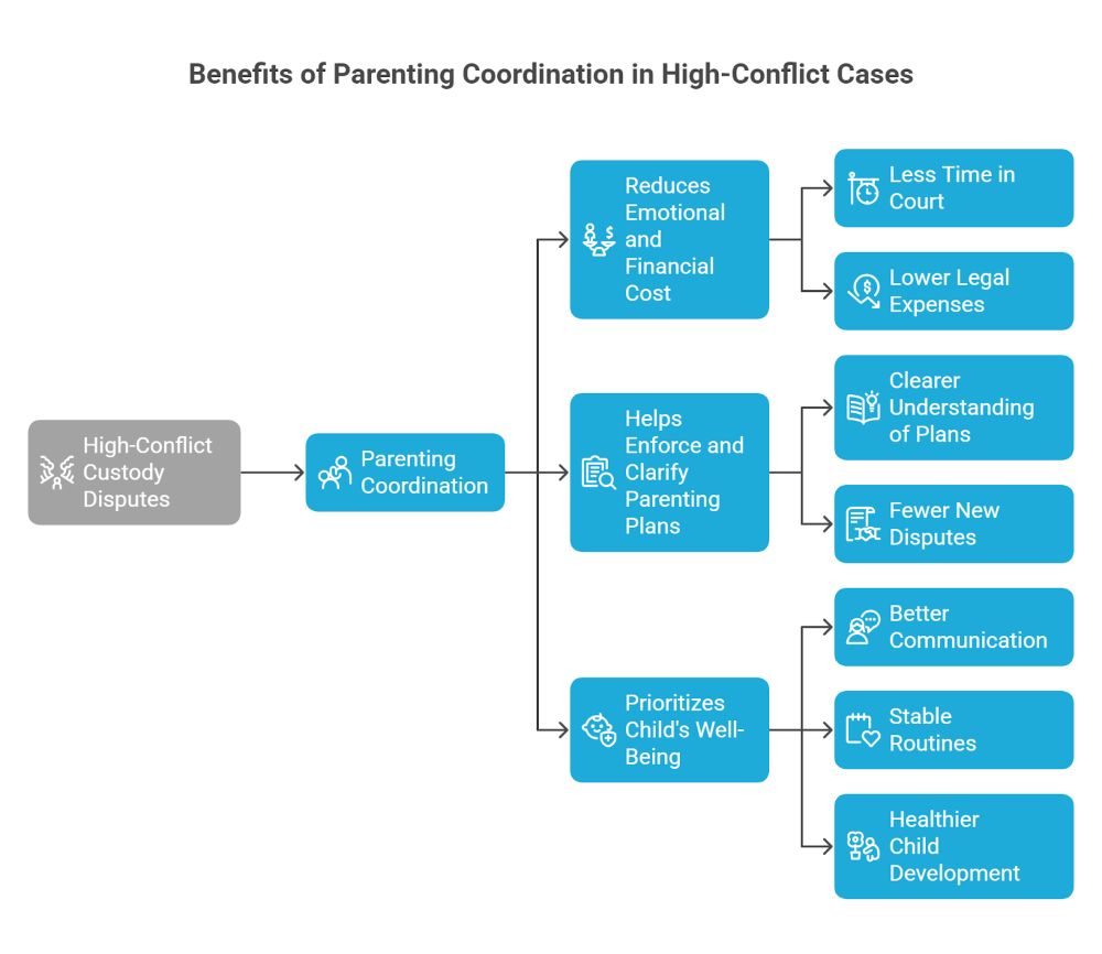 Parenting coordination provides tangible, measurable benefits to families navigating ongoing conflict during custody disputes in Illinois.